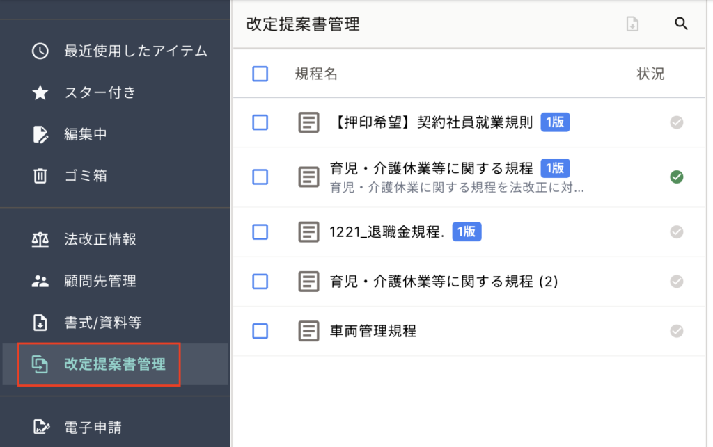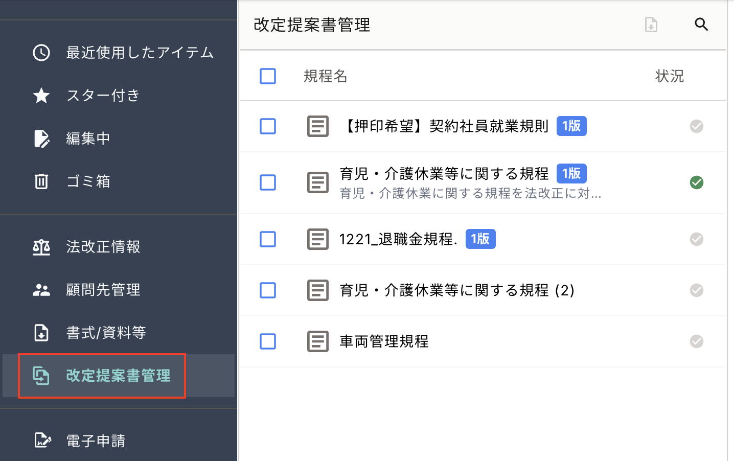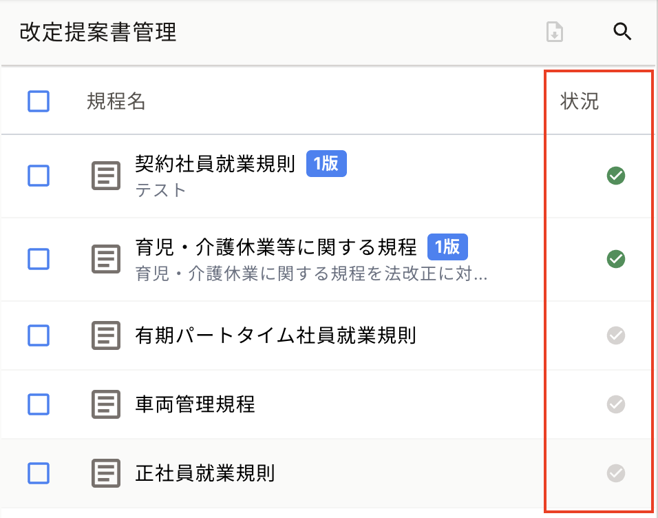 ・緑のチェックが付いている:改定提案書を作成済みの規程