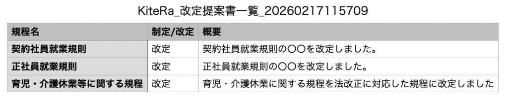 ダウンロードした改定提案書一覧には、 規程名ごとに改定提案書の作成状況などが記載されます。