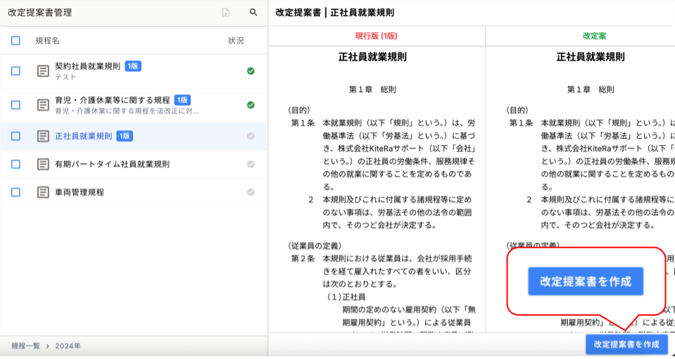 1.規程を選択し、画面右下の[改定提案書を作成]をクリック