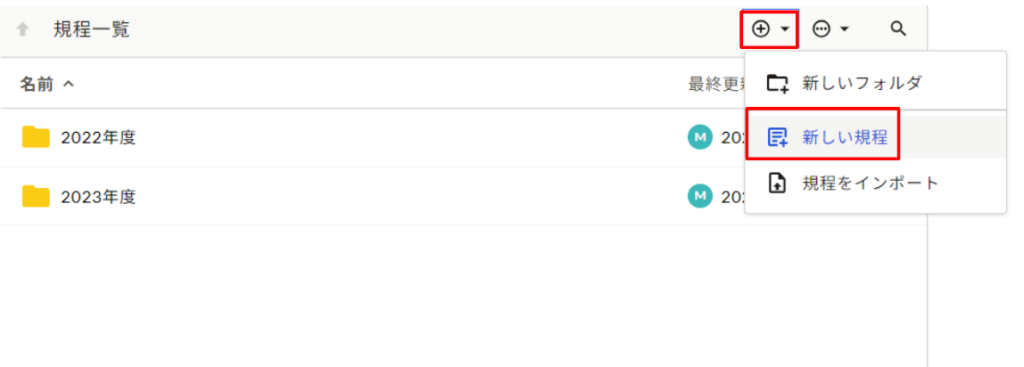 1. 規程一覧画面の[+]ボタンをクリックし[新しい規程]を選択