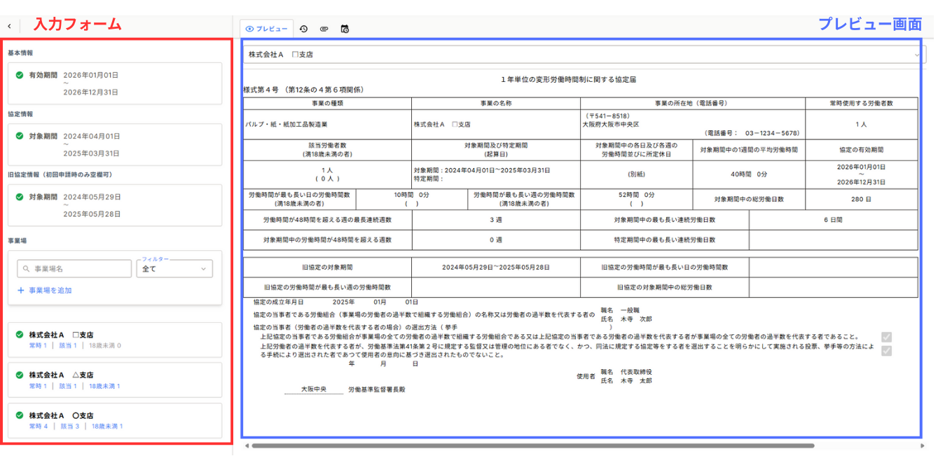 事業場が複数ある場合には、プルダウンボタンからプレビュー画面を切り替えることが可能です。