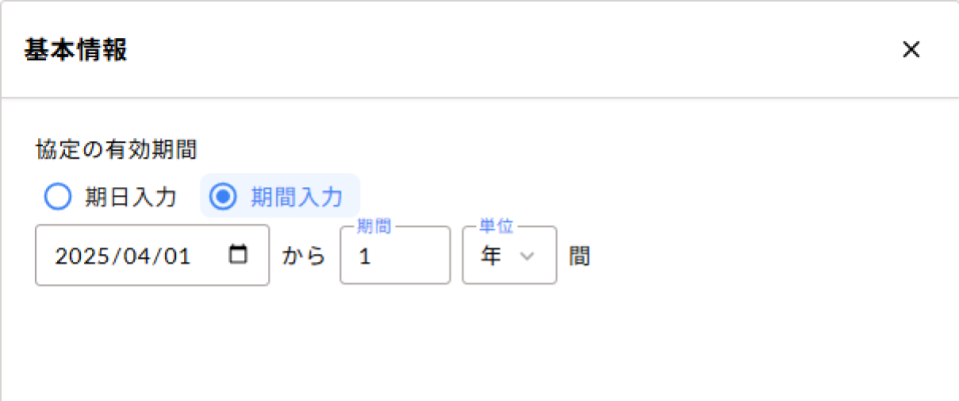 協定の有効期間は、ラジオボタンで[期日入力]または[期間入力]のいずれかの入力方法を選択することができます。