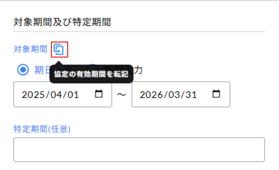 [対象期間]は、先に入力した基本情報[協定の有効期間]と同じである場合、