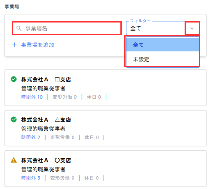 追加した事業場は、「事業場名」欄と「フィルター」で絞り込むことが可能です。