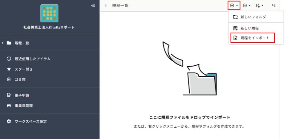 1. 規程一覧にて右上の[+]ボタンを選択し、[規程をインポート]をクリック