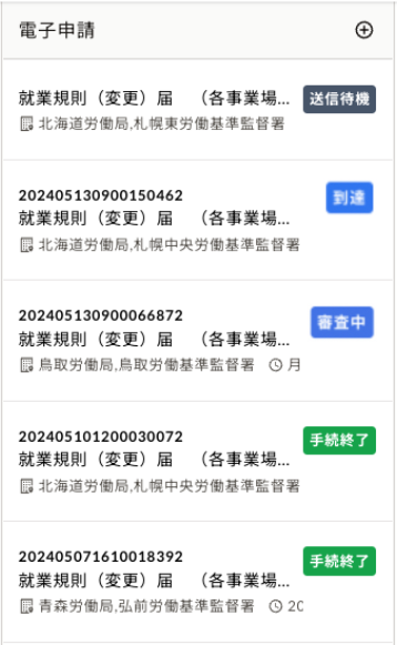 送信待機 → 到達 → 審査中 → 審査終了 → ⼿続終了