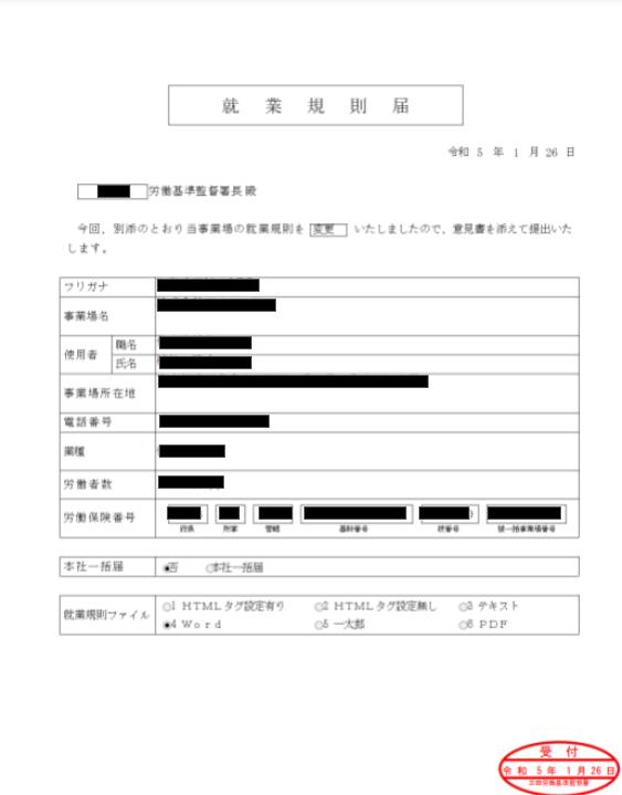 なお、2023年2月末のe-Gov仕様変更に伴い、就業規則本体や添付資料にも受付印が押される場合があるようです。
