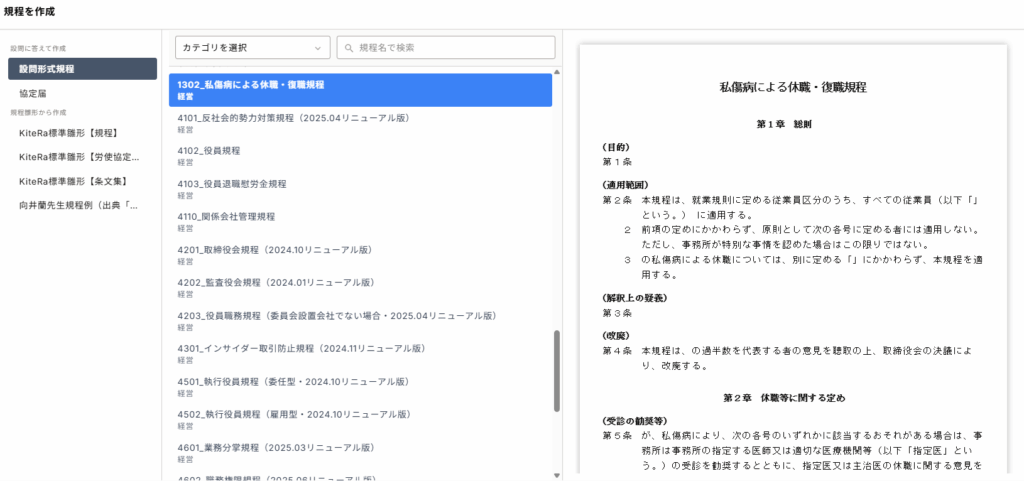 規程 KiteRa規程雛形を新たに追加しました 2025年12月10日 ページを印刷 設問形式(設問に答えて作成する形式)として、下記の規程を追加いたしました。 追加された規程 私傷病による休職・復職規程 規程の概要 標準雛形でご用意していた「私傷病による休職・復職規程」について、この度設問形式でもご利用いただけるようになりました。KiteRaの「私傷病による休職・復職規程」は、「休職・復職規程」のように休職事由全般を定めたものではなく、私傷病に起因する休職および復職に関して、より具体的かつ詳細に定めております。設問で変更できない規程内の名称等に関しては直接編集の上、ご利用ください。