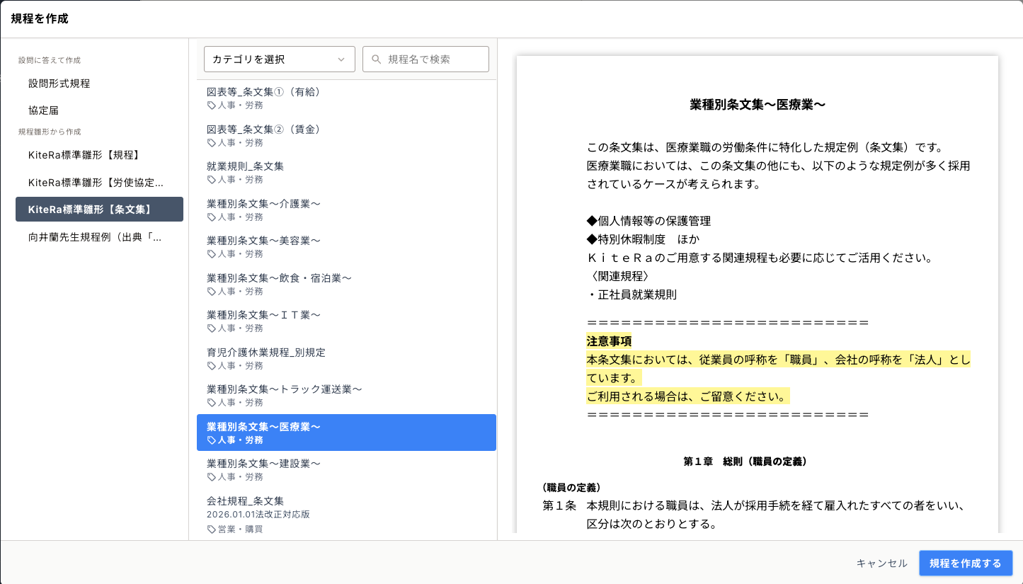 条文集は、KiteRa標準雛形や設問形式雛形の就業規則における別規定例(条文)を纏めたものです。